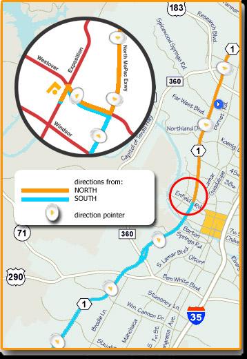- MoPac Expressway [North] - Exit [right] from MoPac at the 'Westover' exit. - Continue under the overpass (MoPac Expressway) [left] onto Westover - Continue down Westover, turn [left] at traffic-light (corner of Exposition). [landmark] From the intersection the Carillon building is viewable across the street on your left - the South-west corner of the intersection. - Turn [left] onto Exposition and then turn [right] to enter the rear parking lot (two entrances past the intersection).